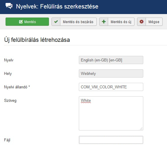 Természetesen az egyedi mező nevét is hasonlóan kell beírni. Nem "Szín"-t adunk meg, hanem Pl: COM_VM_LABEL_COLOR, ami több nyelven van definiálva a Felülírásokban.